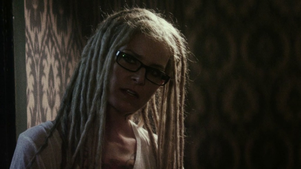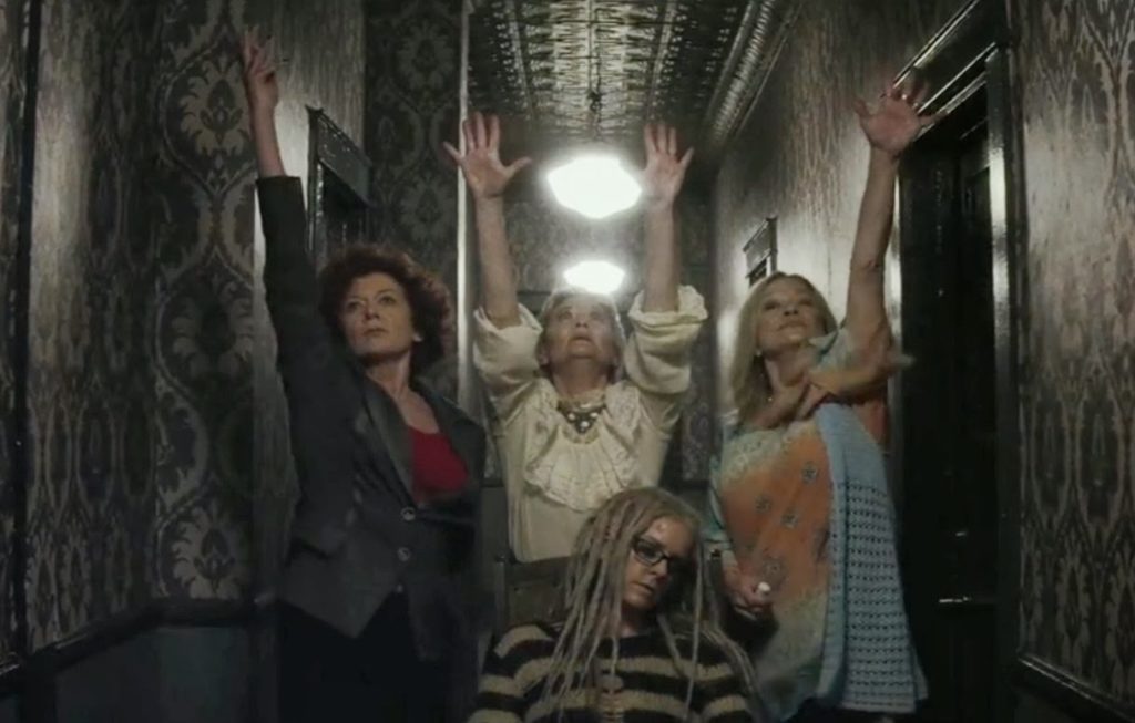 Fortunately, that wasn’t the case here although the acting was definitely not all aces but we’ll revisit that topic soon enough. Some observances: Zombie’s wife is the headliner here, all dolled up in her dreadlocks and her bare ass on display. Awwww – she looks nice and cute in her glasses and her super flared out bell bottoms. How Alt Culture! I see there’s her ass crack again. AAAHHH I see! She works at the local Salem radio station where they play Alt Metal! Cool cool. Oh, Ken Foree again. Hm. I see that all of the exterior shots of the buildings in Salem show nice houses with lots of windows…. yet… I do notice that EVERY SINGLE interior scene is almost black and white with no natural sunlight, even during the day. Is Zombie trying to say something with his use of chiaroscuro? Or is this just something that ends up getting tired and old by the 20th time we see it, kind of like the slow tracking movements down that wallpapered hallway with the thumping heartbeat? Or the guy trying to investigate the myth behind that record album? Or the three irritating sisters? Or Moon-Zombie’s ass? I mean, I’m all for a nice butt but – ok – let’s make a deal about her taking drugs and sleeping it off on the couch. Cool cool. Why is her ass uncovered? Speaking of those sisters…