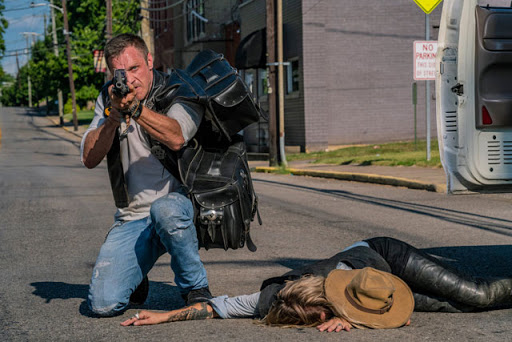 I think – but I’m probably wrong – they killed off the biker gang’s Tough Bitch during the big Girl Fight in the church but she’s back a few minutes later toting the machine gun…