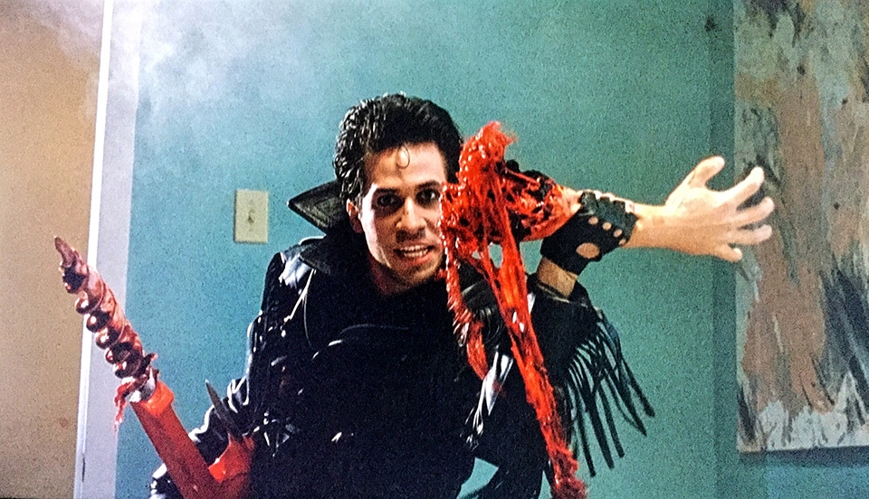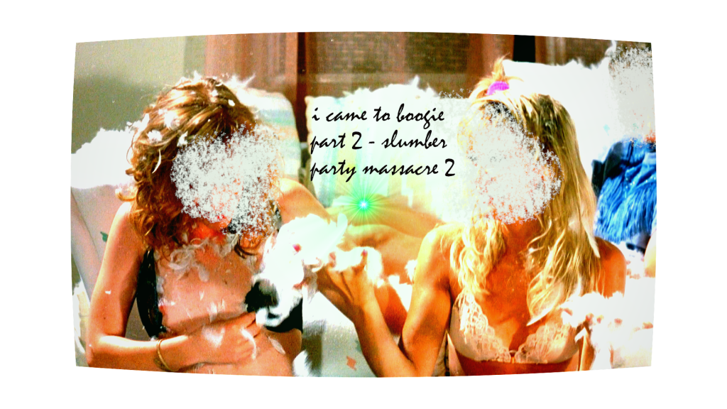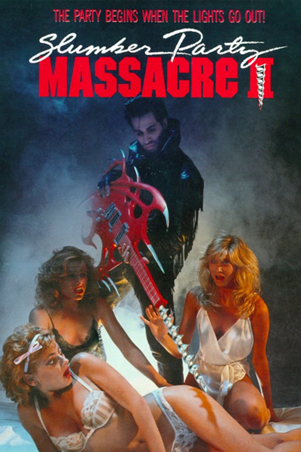 This time, instead of a power drill, we get an electric guitar with a drill built into it. This time, instead of a doob filled night of swapping t-shirts and tossing cigarette butts out of windows, we get a topless champagne dousing and some pillow feathers flying around for good measure. We also get some dream sequences involving the younger sister from the first movie who used to “beat off to pictures of Burt Reynolds” dreaming of hunky boys (and girls) only to have them brutally murdered when she – uh – gets ready to do some drilling herself. I guess girls don’t normally do the drilling, right? Teenage guys do. Porkin’ and drillin’ and bangin’ and whatnot? As I mentioned in the first post of this series, I never got invited to champagne-bath slumber parties and never really did a lot of high school sex. I wanted to, sure, but the occasion never really presented itself, I guess.