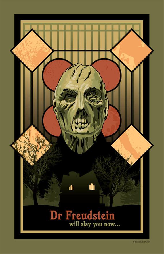 A man, woman and their horribly dubbed kid move from New York to a dilapidated house out in the trees in Massachusetts so the man can research something involving someone named Freudstein. Inside the house is a tomb in the ground in the hallway with the name Freudstein carved into it and outside and around the house are gravestones, a little ghost girl and some sort of ghost maternal figure. Attached to the kitchen is a basement that goes straight to hell. Or the lab or Freudstein where he skinned and killed women and children. Or a dark cavernous place where ONE unkillable bat lives. Or The Cellar Where Two Orange Eyes Glow So Don’t Go Down There For Fuck’s Sake Kid!! Or lastly, the place where a young lady should never go because she might get her head sliced off by a killer with a woman’s hand even though – well – ahem.