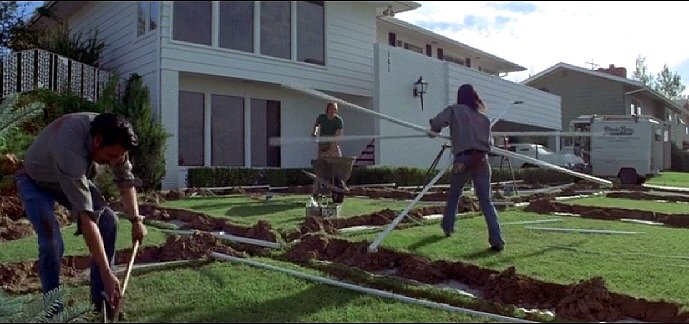 There’s also a section where they all go get jobs to try and make a little money while they order the parts for the cannon they’ll need. Eastwood gets a job welding, Geoffrey that’s right Every Which Way But Loose Lewis drives an ice cream truck and Bridges gets a job installing a sprinkler system. But, in the sense of everything, aside from just seeming random, they make sense. Lewis is plotting out the city, Eastwood is honing up his mechanics and the crew needs that truck in the background of that pic. Plus, for good measure, they throw in Vic Tayback, Gary Busey and a random nude woman just for the fun of it. Oh – and Kennedy has a job cleaning floors in the local department store which is guarded by viscous dogs at night. And, he has hayfever.