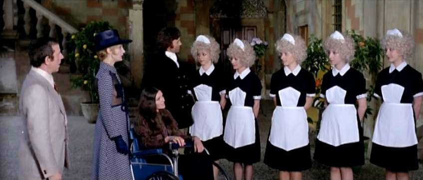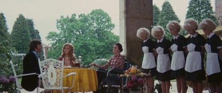 “You need to quit this, you’re ill,” advises his resident, castle dwelling doctor. “You need to get over your dead wife, Evelyn.” “OK,” he responds coolly, drinking scotch and smoking cigarettes. “I’ll go marry someone”. So he swiftly does and they roll back to his castle and promptly meet – which I personally think is the best part of this movie even though it has nothing to do with anything – the five identical looking maids his wheelchaired aunt has hired to serve them.