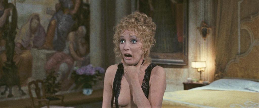 This starts off with a lengthy sequence of a man running loose in and around the local insane asylum. Is it present or flashback? It’s giallo so – who really knows? Next up, some guy is tugging on some woman’s hair to see if it’s a wig. “It’s my real hair” she says, lighting a smoke. “I’ll give you 500 £ to spend the weekend with me” he coerces before luring her to his dungeon and whipping her to death, while someone’s doing some of that clandestine, shadowy eyeball peeping. Sorry if that’s a spoiler. She may or may not come back from the dead later so….