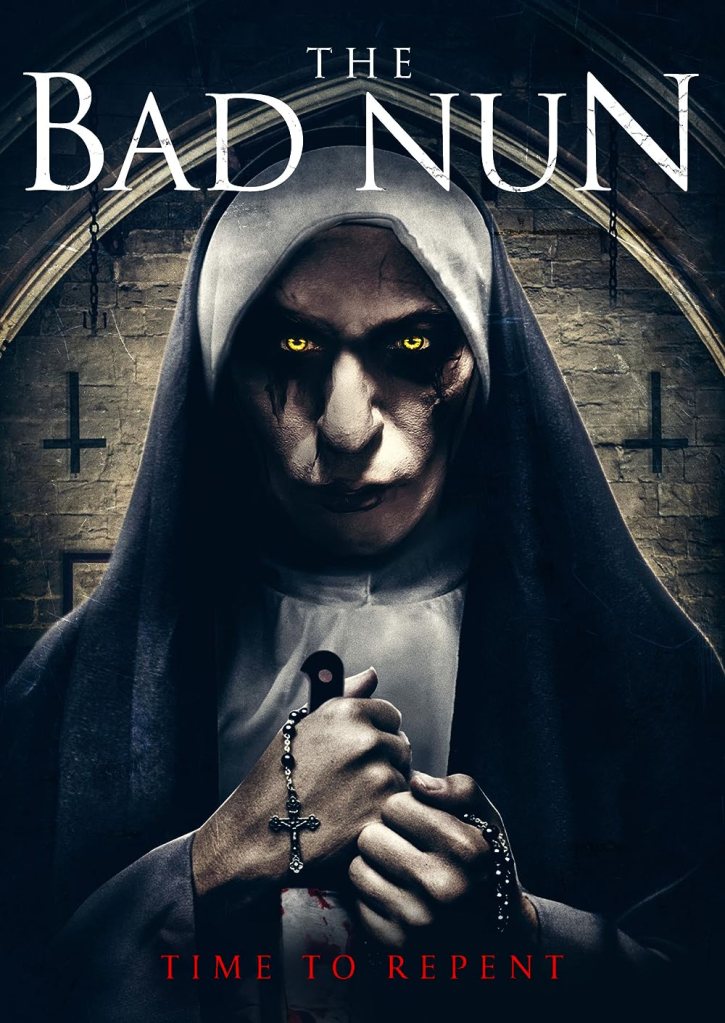 Someone might remember that I teased this concept / theme / exciting news several posts ago, or maybe not, who knows but my first movie into this nun project is some kind of mixture of carbonated horse pis – wait – no. “Tell me about your butthole,” says the psychologist, whispering, eyeing you. No that’s not it either. Maybe -> nothing says you’ll love this movie like a poorly paintbrushed poster of a person with fake, glowing eyes staring at you. Maybe if the mouth of that individual was stretched open like Lake Michigan we could truly expect something epic but that isn’t what we got and I guess it’s my fault for doing this to myself. I don’t remember what really got us to this point in the first place but something unlucky happened to me and I added a bunch of nun movies to my queue and thought man I’ll watch all of these, what a great idea, and here we sit today reflecting on The Bad Nun which is, no doubt, a terrible thing that makes this euphemism come to mind: so bad it’s not even worth putting anything into your popcorn hole. But we have to be fair so let’s quit with all of that and do quality reporting even though we all know none of my writing is quality anything but we press on anyway, in defiance.