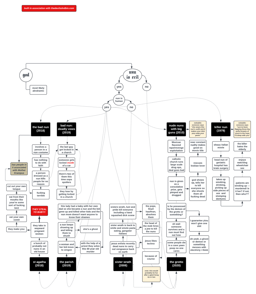 More importantly!! Here’s our updated diagram! This is really heating up and shit’s getting real! Another amazing thanks to The Devil’s DVD Bin for his excellent and thorough research into the matter and we present here Nude Nuns With Big Guns – a true gem of a picture. And that’s not all we’ve got in store…… isn’t that called foreshadowing? Thank you so much, sir! For The Arts!