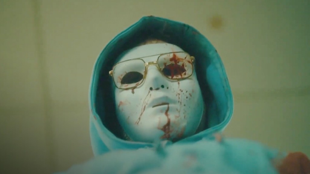 In here, there’s mention of The Dark Arts of Bowling! Excitement! But then someone holes herself up in a room, protected from murdering assholes by nothing but a weak door handle lock. There’s a dude in a bowling pin mascot costume! But there’s also this gen z kid who keeps using the word “cock” over and over. “Jeez cock,you’re being such a cock.” “Man these shoes are cock.” “I’ll stop acting like cock if you pick up that split.” “These crabs in my pubes are real cock.” “That eric undead blog is certainly not the tits and just cock.” But I really did like the fact they had a killer with glasses over his mask – I thought that was clever. And the girl with the pony tails.