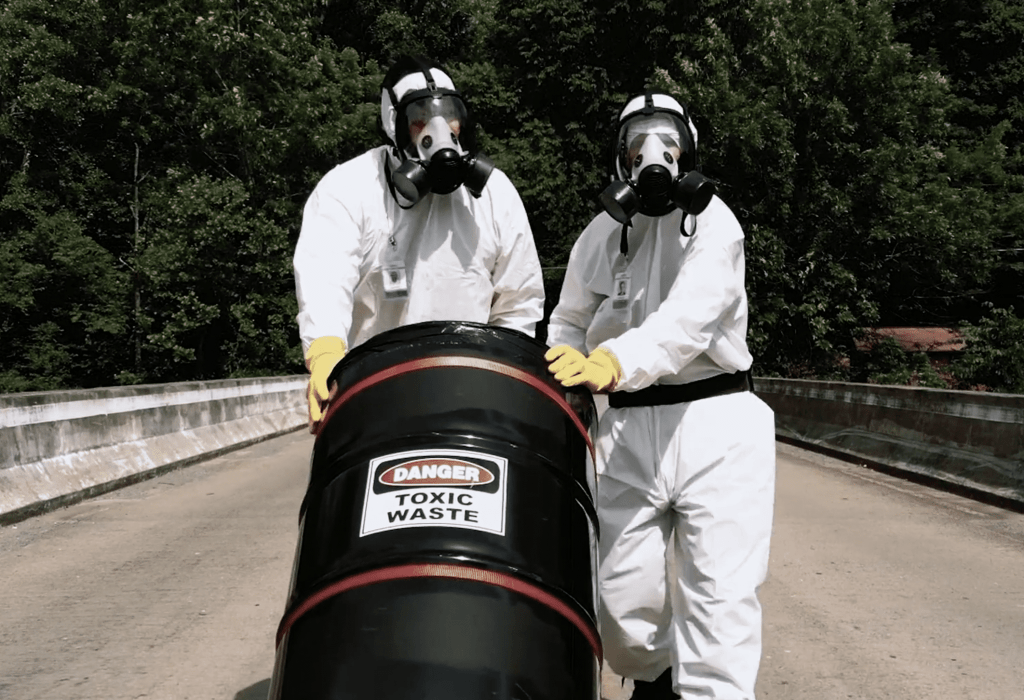 A couple of dudes in hazmat suits throw a barrel labeled toxic waste in a river! A hairy man and his squeeze are going to the lake on a vacation! He’s a self proclaimed dick! At their campsite, even though he’s being an asshole, she decides to perform some oral sensations around his inner thigh region but is disgusted by his untrimmed genital area and demands he shave! Having forgotten his regular trimmin’ razor he comes up with a solution to use a handy straight razor on his scrotum to make things better for her pleasure! Unfortunately, back at the campsite, she senses the local lake dumbass kid guy whipping his hog in the bushes to the sight of a female in jean shorts and she screams, distracting him from his scrotum barbering and he cuts himself in the toxic waste water. Shortly after, everything below his hairy man nipples and above his knees starts to burn so bad that he cuts off his scrotum and it comes alive and starts chasing people through the woods and killing them in a variety of ways.