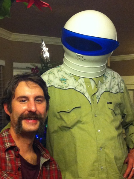 In Sister Tempest a woman is interrogated by people dressed up in things like spray painted colanders, glass orbs, nylon onesies, foam antennae, making bleep blorp sound effects because they are all aliens and they want to know if she can be judged good enough to be translated. In fact and boy did our research assistants have to dig deep on this blog to find this but here’s a picture of the author here circa sheez maybe 2011 or so at a New Years Eve party over at Chris’ old house back when he was married.