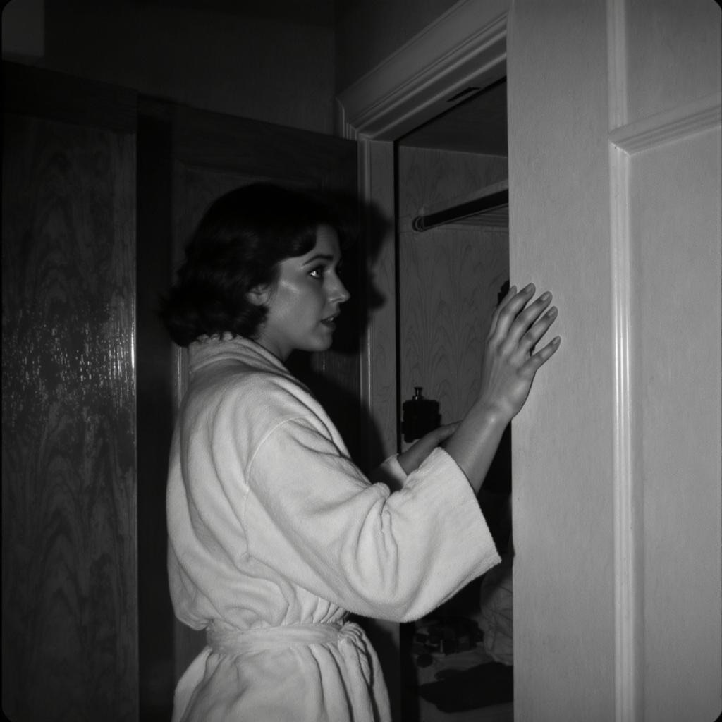 After giving herself a thorough and close up drying, she dons a slightly worn and aged bathrobe, lights the fireplace and turns to rummage in the closet. Maybe she’s looking for some pants? I don’t know but in true Giallo fashion, something pale and wispy reaches out from the depths of the closet and, that’s right, begins to stroke her right thigh. This is a still I found from one of our archives: