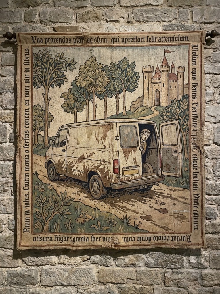 Than man spills his drink! Fumbling to cover his inflammation, his complimentary martini spills down his trouser leg and the woman mistakes that for a different type of fluid. “Dios mio!” She screams in some sort of Central American dialect, her nun’s habit flying off. “Leche demonico!” she screams again and the van screeches to a stop. The man slides forwards in his seat, his inflammation exposed by the seatbelt underneath it, a reverse décolletage. His arms flail, the thought of his French tart replaced by the idea of a scythe rendering him neutral. “Oh this erection! I am your servant! May I bring you lipsticks or jewelry??” he twists internally. “Damn unto you!” With his left hand he excavates his rectal insert; it is scrimshawed and mother of pearl. With his right he unscrews the dagger portion. “Don’t fail mommy now” he whispers and begins to cut at his tether.