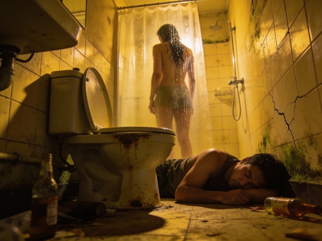 Like our resident douchebag. “I gotta shit! And bust my nut!” He says and goes to the unoccupied (only) bathroom in the haunted house on sorority row. There, he spies a bunch of puke on the floor. “What the fuck! Hey I don’t pick up puke you fucks!” He screams and then wipes up the puke with a towel. As he throws it in the tub he notices the shower is now on and there’s a moderately aged female in there and she screams “you didn’t even know if I was alive or dead when you fucked me” and he’s all “what huh” and she screams it again and then he falls on the floor puking his own puke and dies (presumably) (and blocks the only bathroom door). So – it seems there actually is something going on depth wise here even if things have been a little strained.